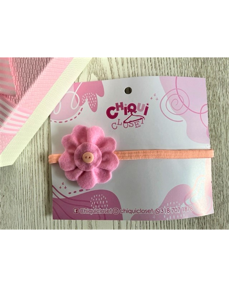 Linda balaca con elástico mediano, acompañado de una hermosa flor de material muy suave y centro de botón.