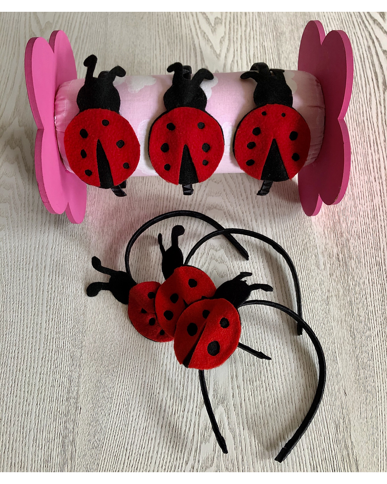 Linda Balaca forrada con cintas y con Adorno en fieltro de Mariquita, colores rojo y negro
