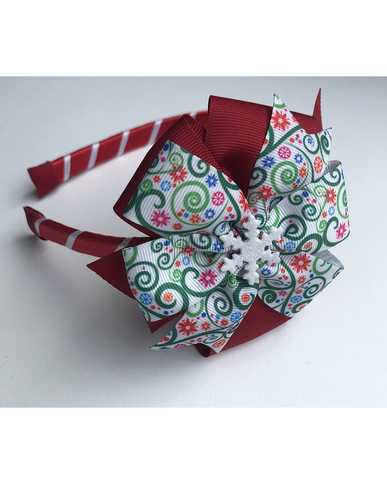 Linda Balaca navideña con cintas Roja y Blanca de estampado navideño evoca toda la magia de la navidad.