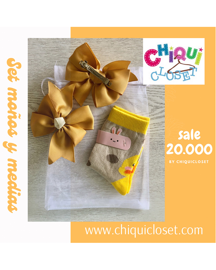 Par de Moños tipo corbatin, gancho banana y par de Medias cortas en color beige y amarillo, con detalle de Patito