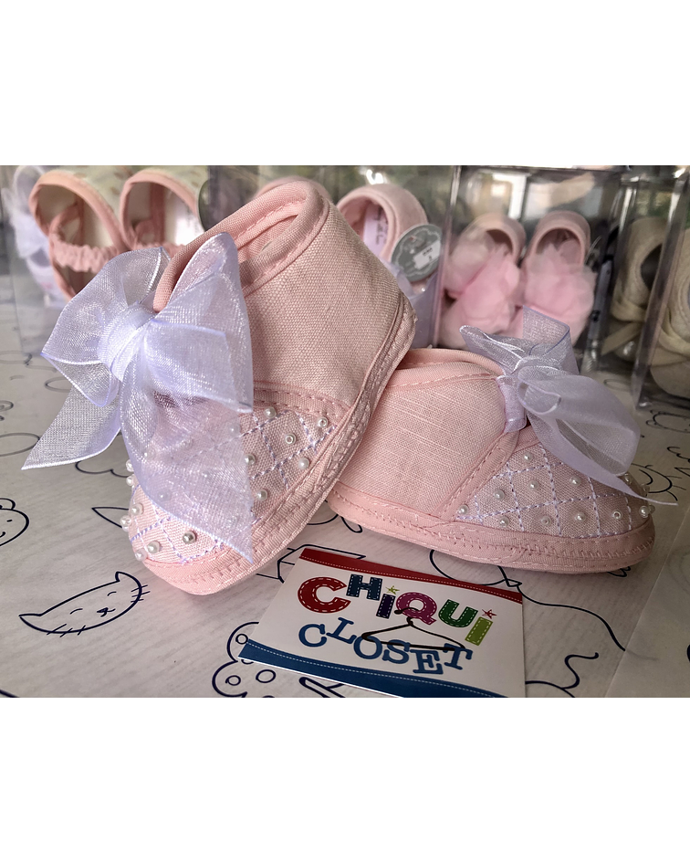 Hermosos zapaticos tipo baletas de jean con Moños como cordones de tul blanco, y detalles de perlas en toda la parte frontal del zapatito