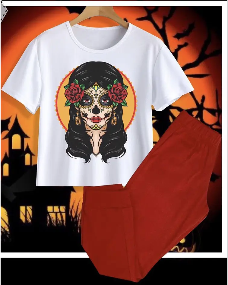 Divertida pijama para halloween con estampado de Frankenstein, pantalón largo color rojo y camiseta de manga corta