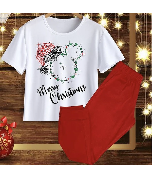 Divertida Pijama Navideña con camiseta manga corta estampada con silueta de Mickey Mouse navideño, pantalón largo color verde, la pijama viene con pantalón verde no como se muestra en la foto
