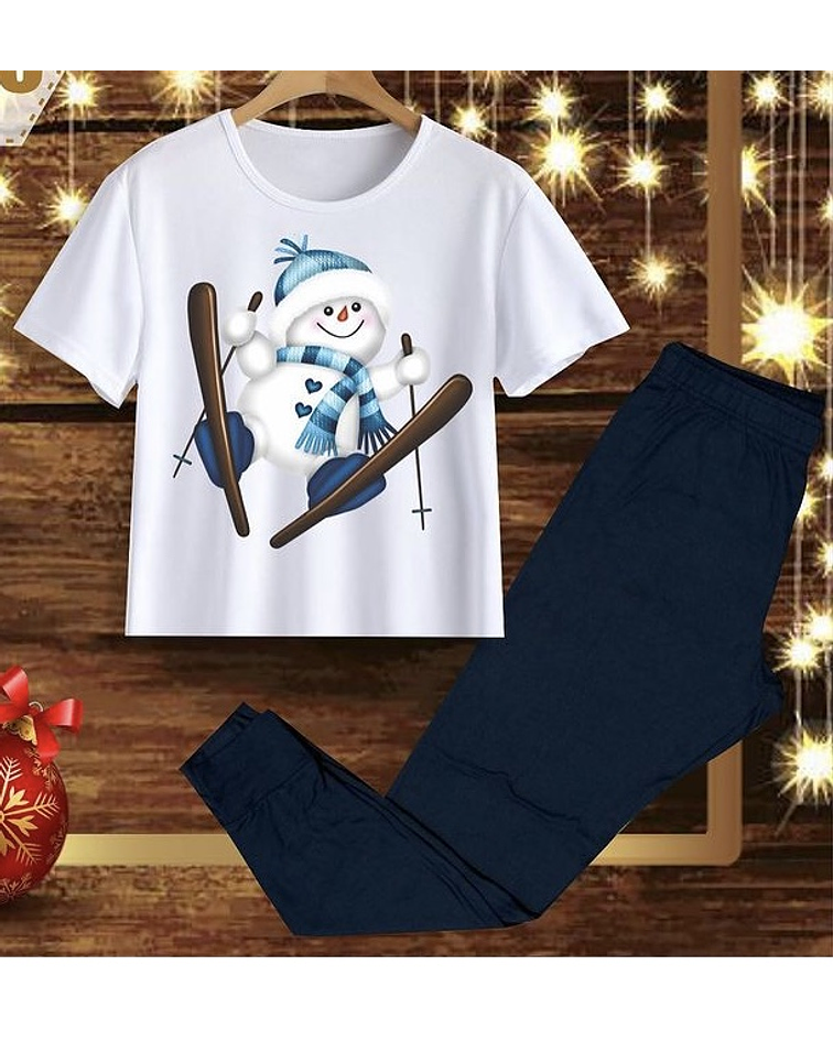 Divertida Pijama Navideña con camiseta manga corta estampada con Lindo Muñeco de Nieve, pantalón largo color azul