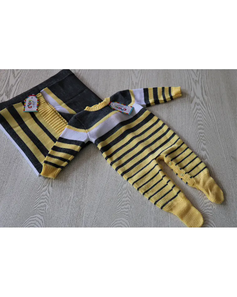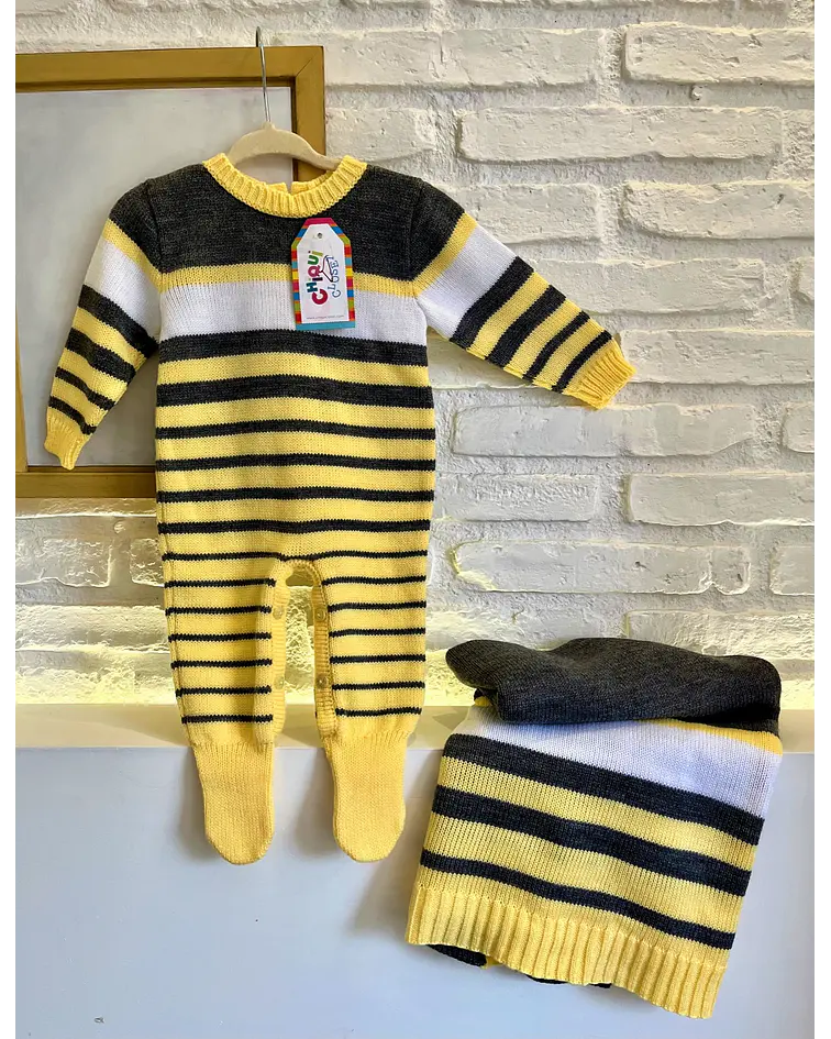 Set de tres piezas tejido, Incluye mameluco amarillo combinado y cobijita combinada. Un set con diseño tierno y divertido.